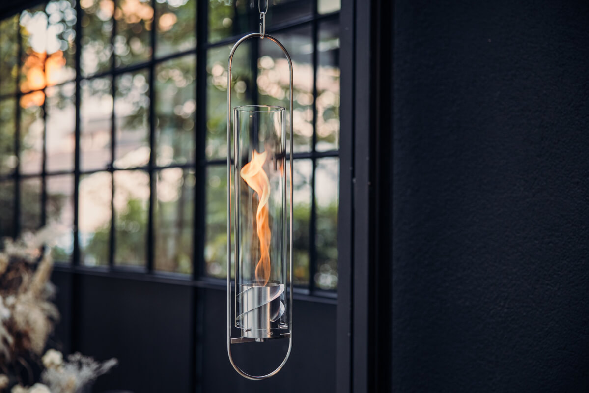Spin Hanging fire – a vortex of flames in a decorative glass cylinder that seems to magically float in the room.