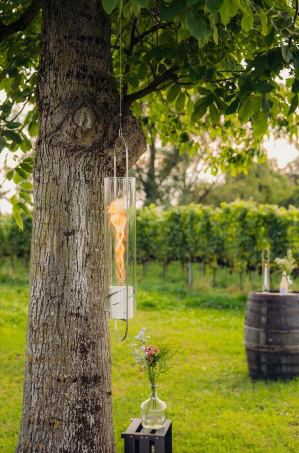 The SPIN hanging fire can be attached to a hook or hung around a tree branch at different heights with the help of the delicate yet strong stainless steel wire and hook, both which are included in your box